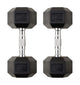 Durable rubber-coated hexagonal weights. The hexagon-shaped rubber-encased ends help prevent rolling and facilitate stay-in-place storage